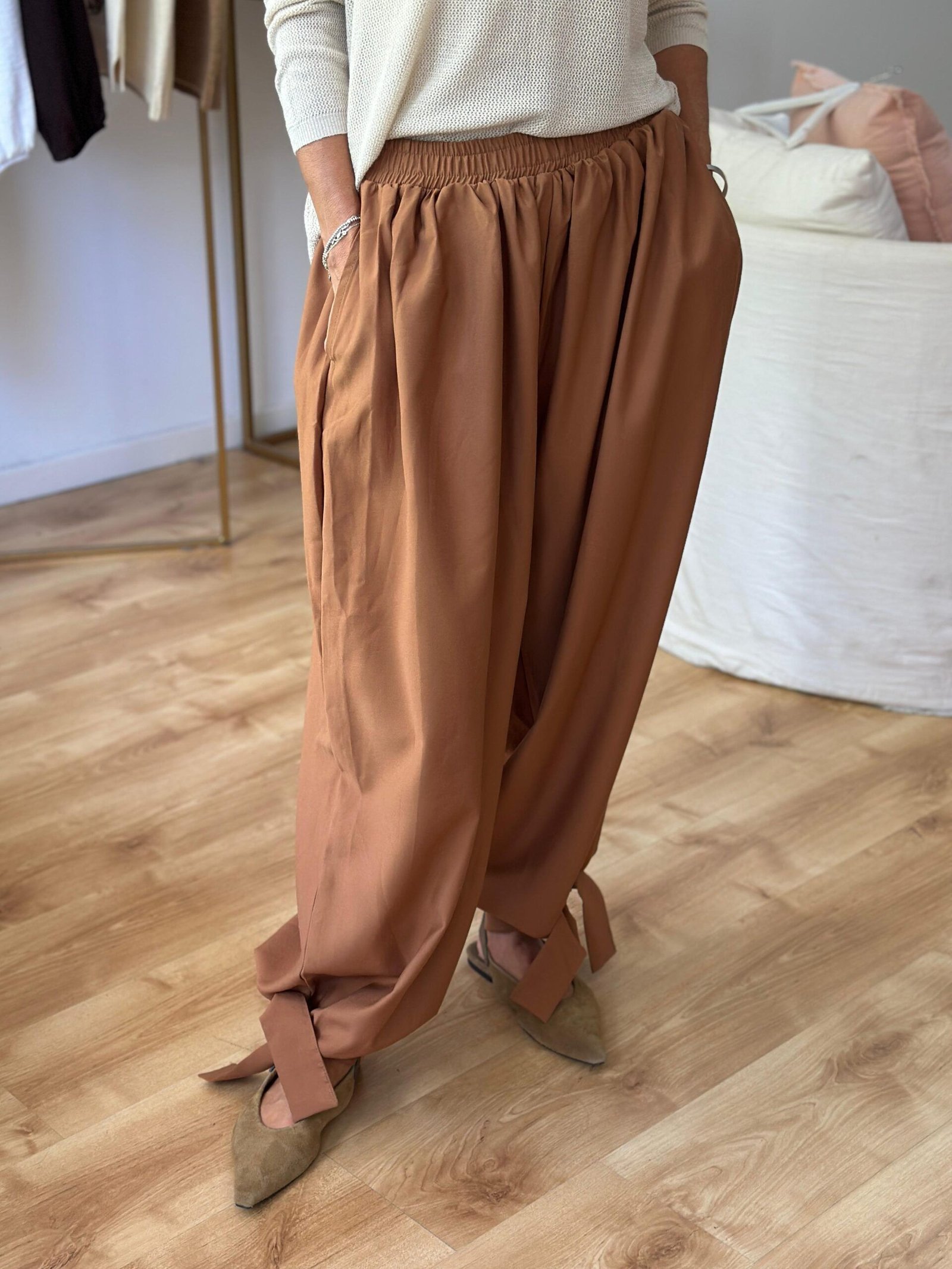 Babucha sastrera con elástico en cintura, lazo en puños y bolsillos