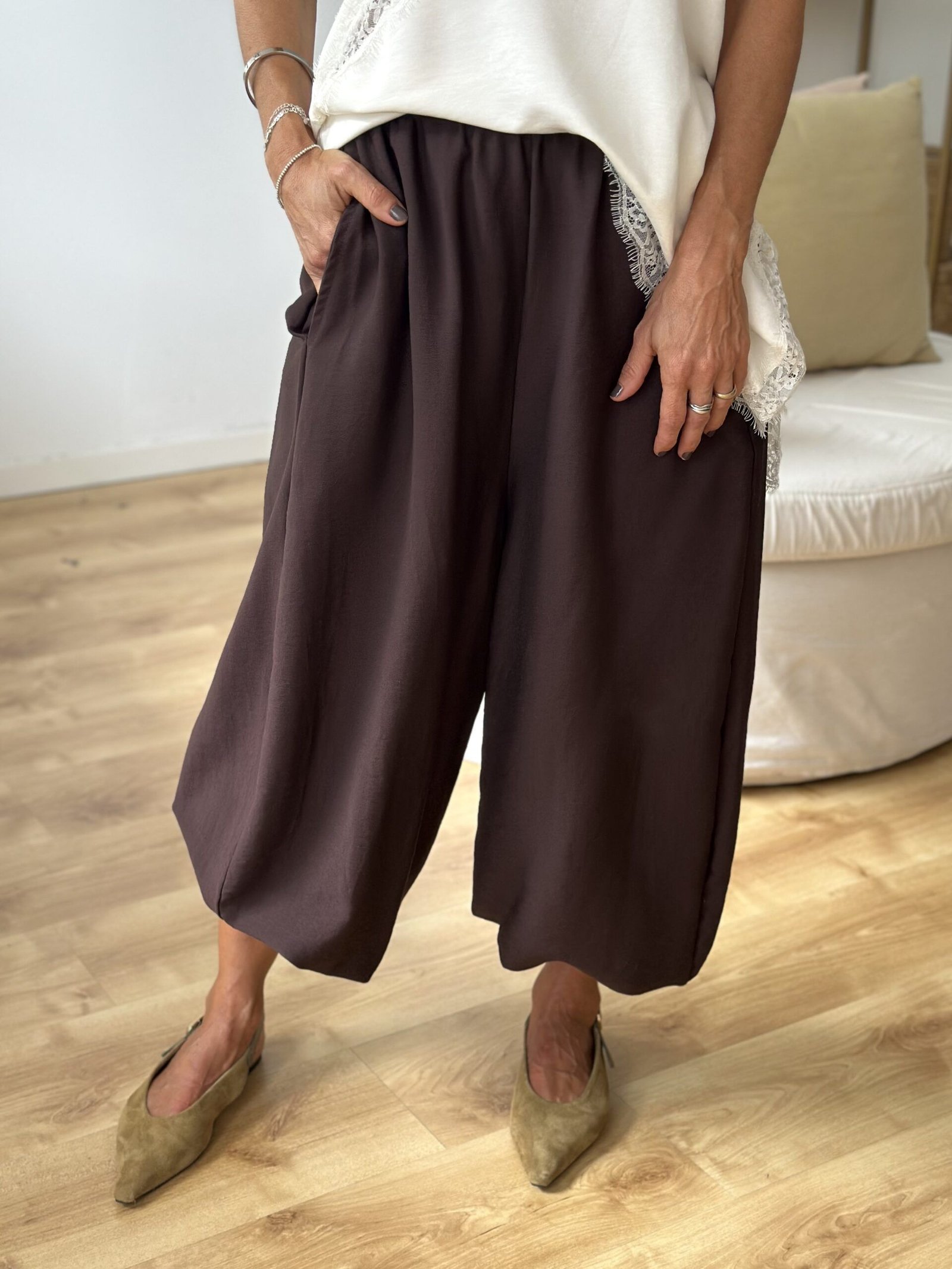 Babuchon creppe con elástico en cintura y puño y bolsillos