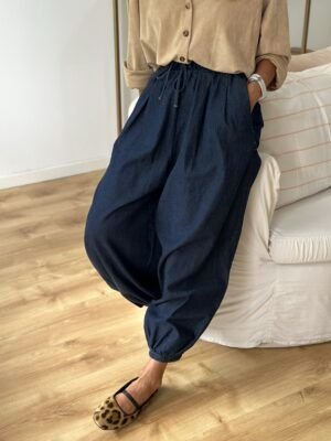 Babucha en denim camisero con cintura elastizada, bolsillos delanteros y puño con frunce