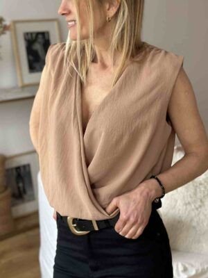 Blusa crep lino sin manga cruzado adelante hombreras fruncido en hombro
