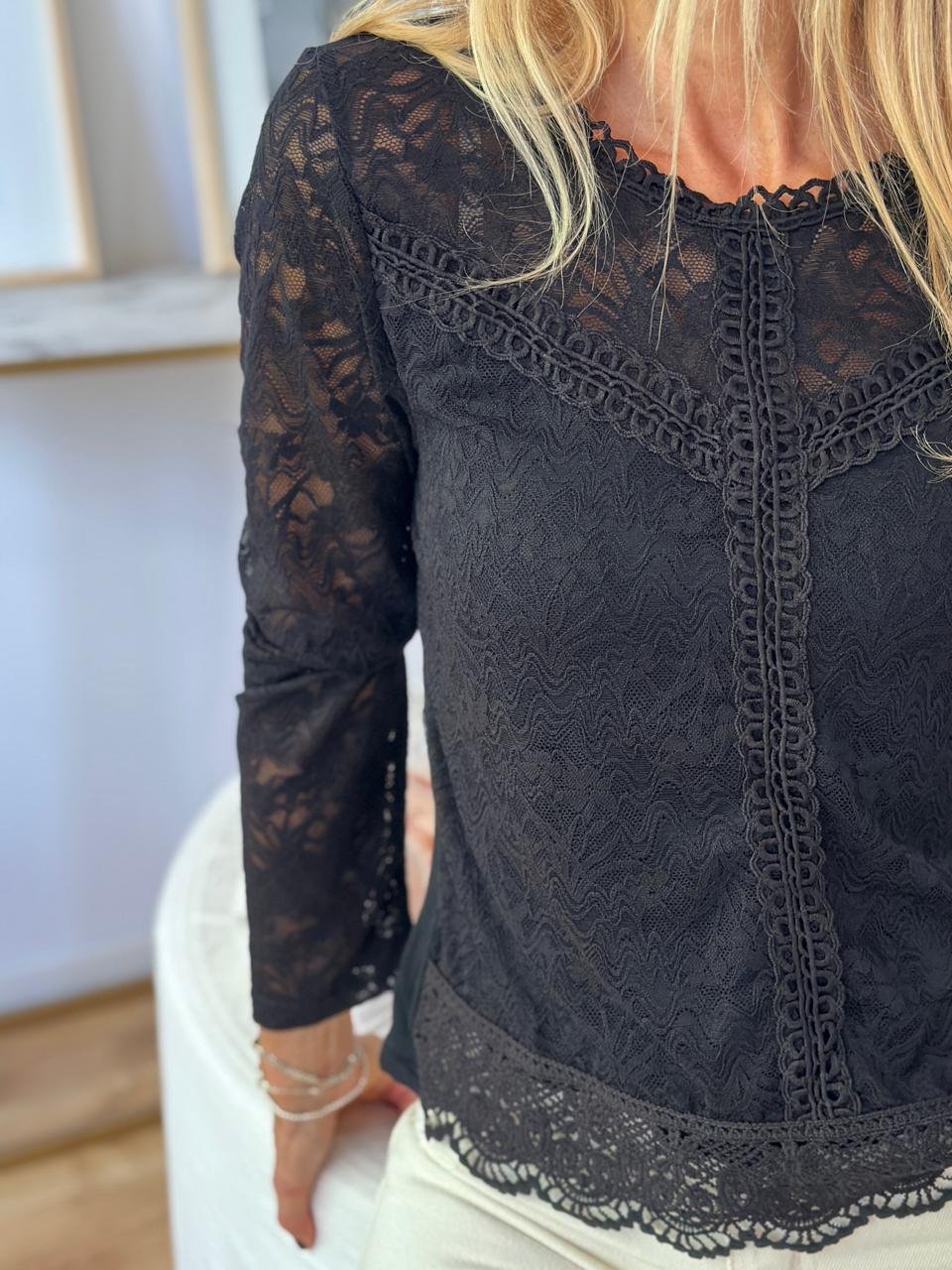 Blusa de encaje con escote redondo y mangas largas, gota en espalda