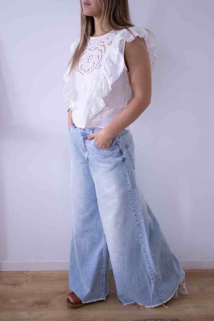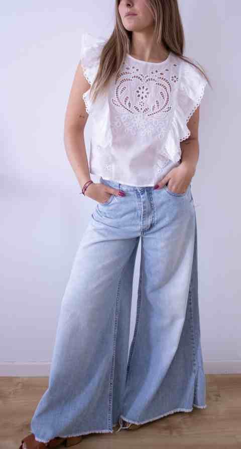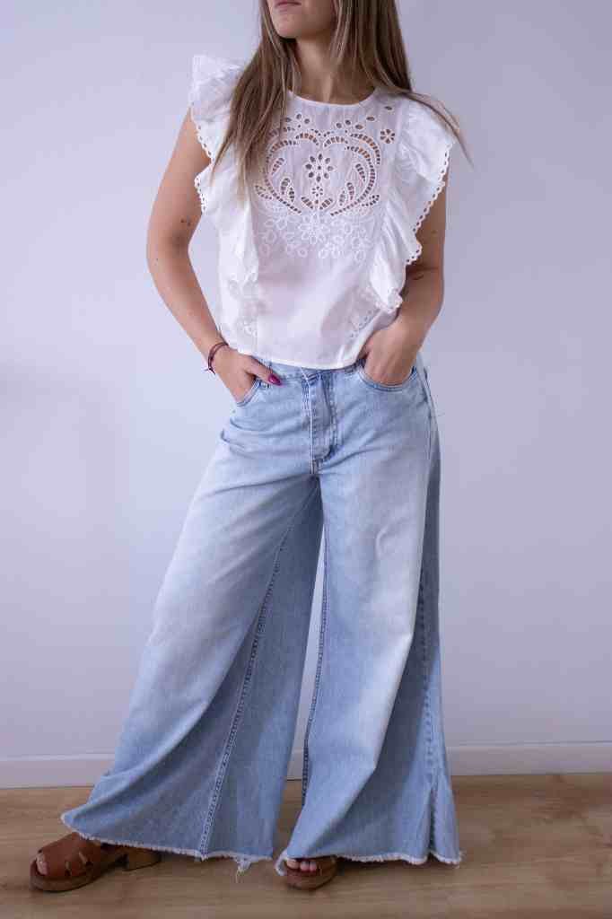 Blusa de voile bordada y calada sin mangas, con volado en frente y espalda
