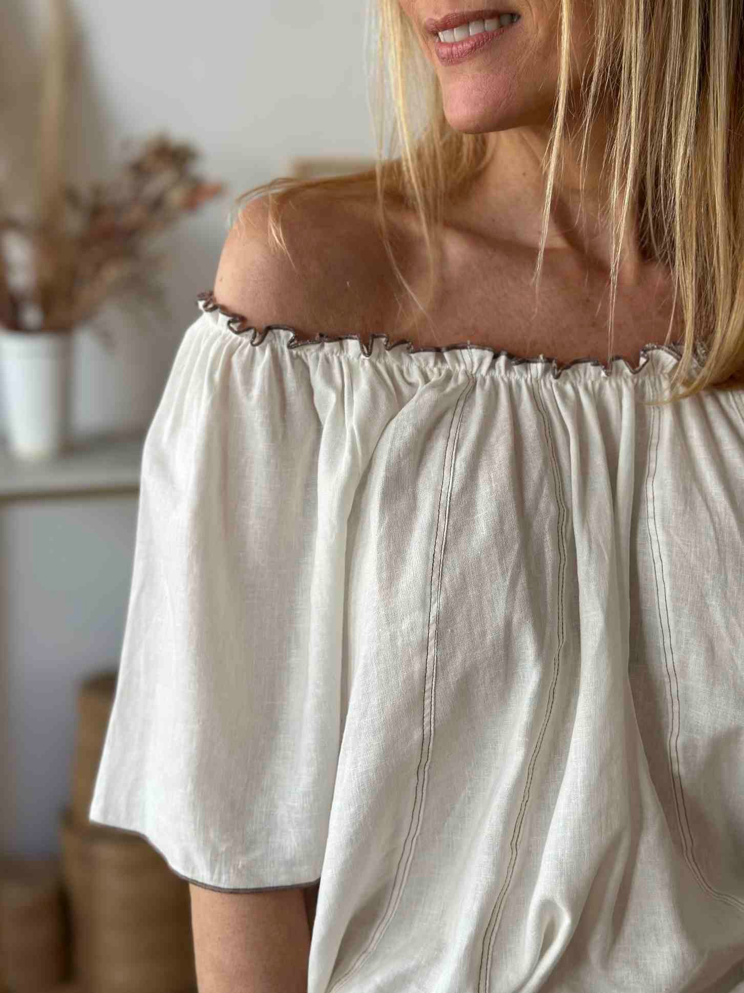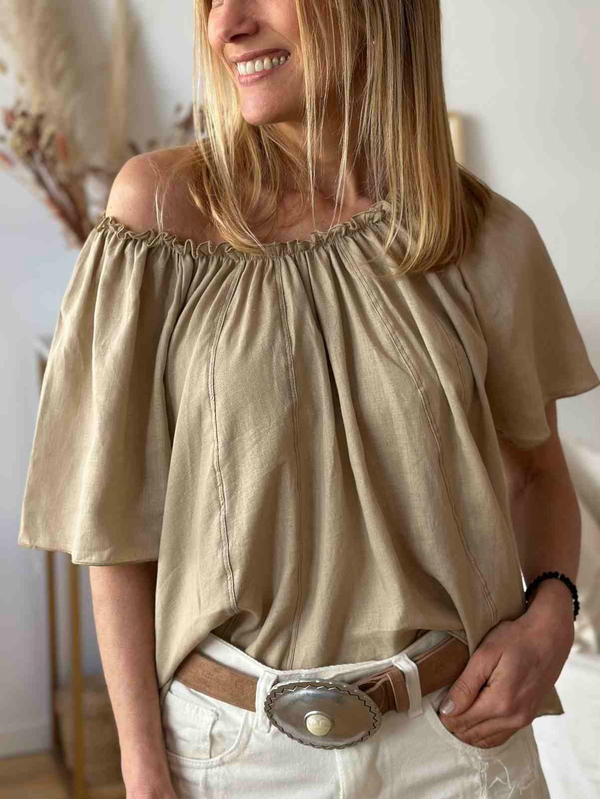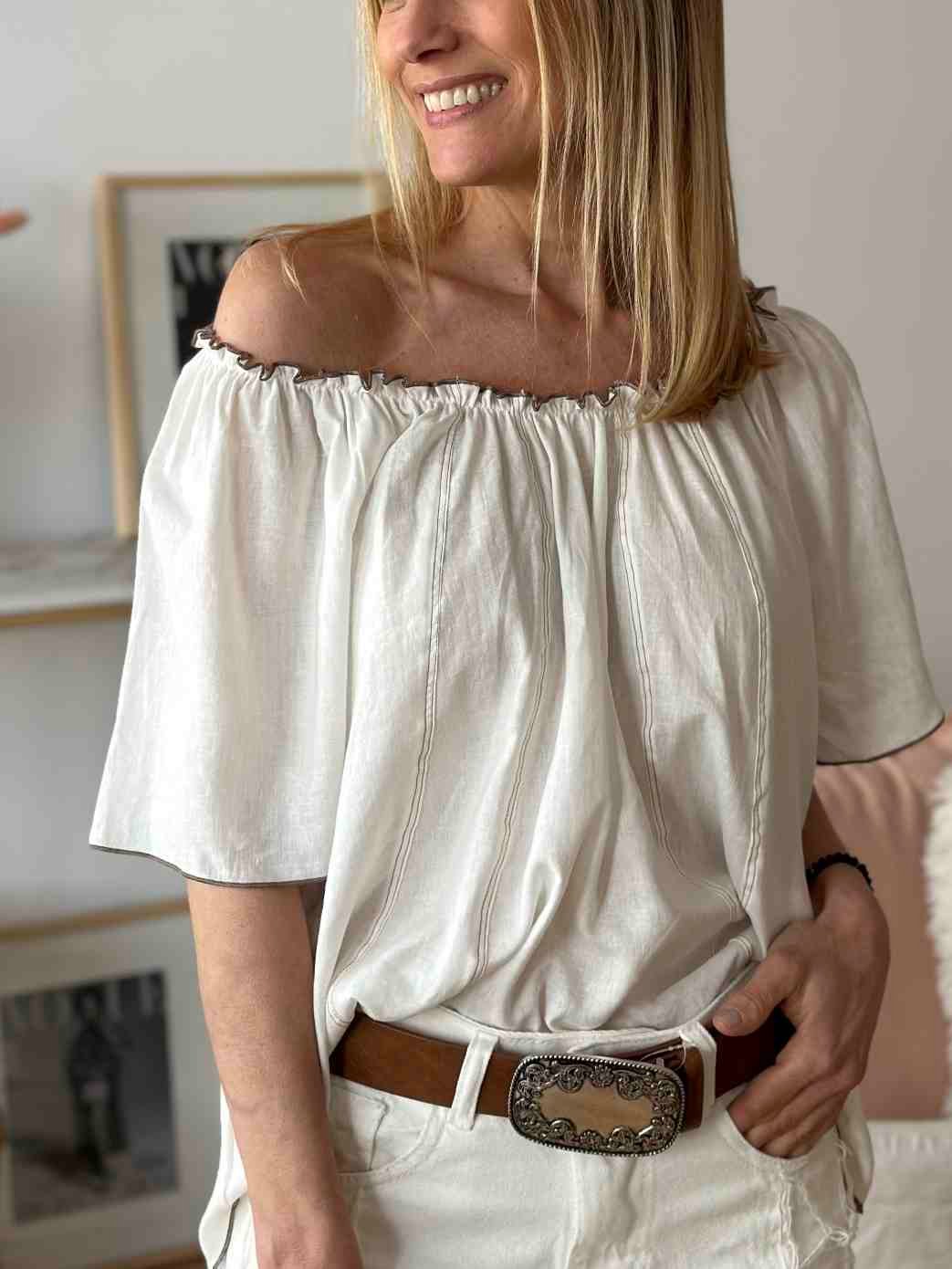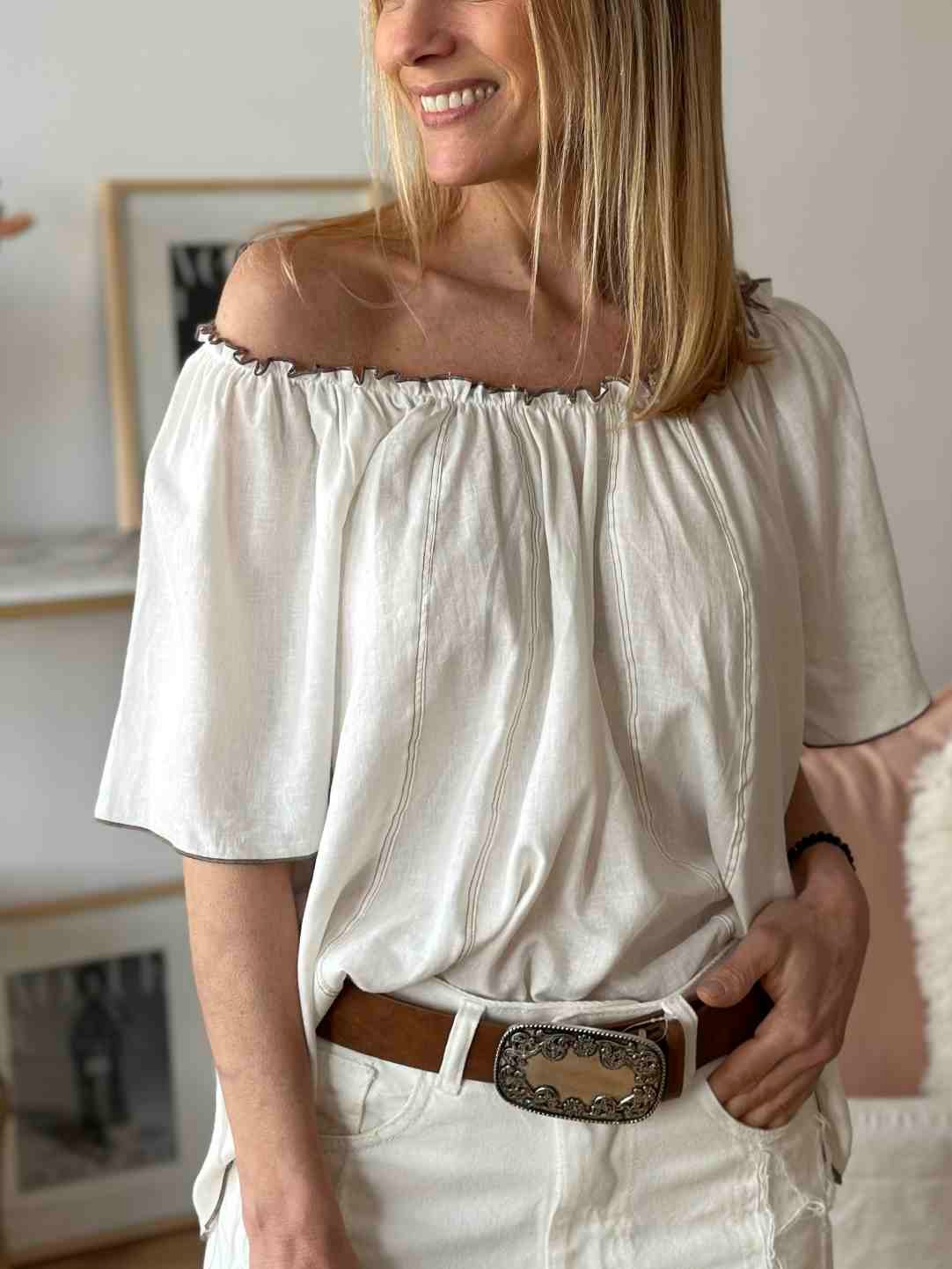 Blusa lino estilo paisana con costuras contratono