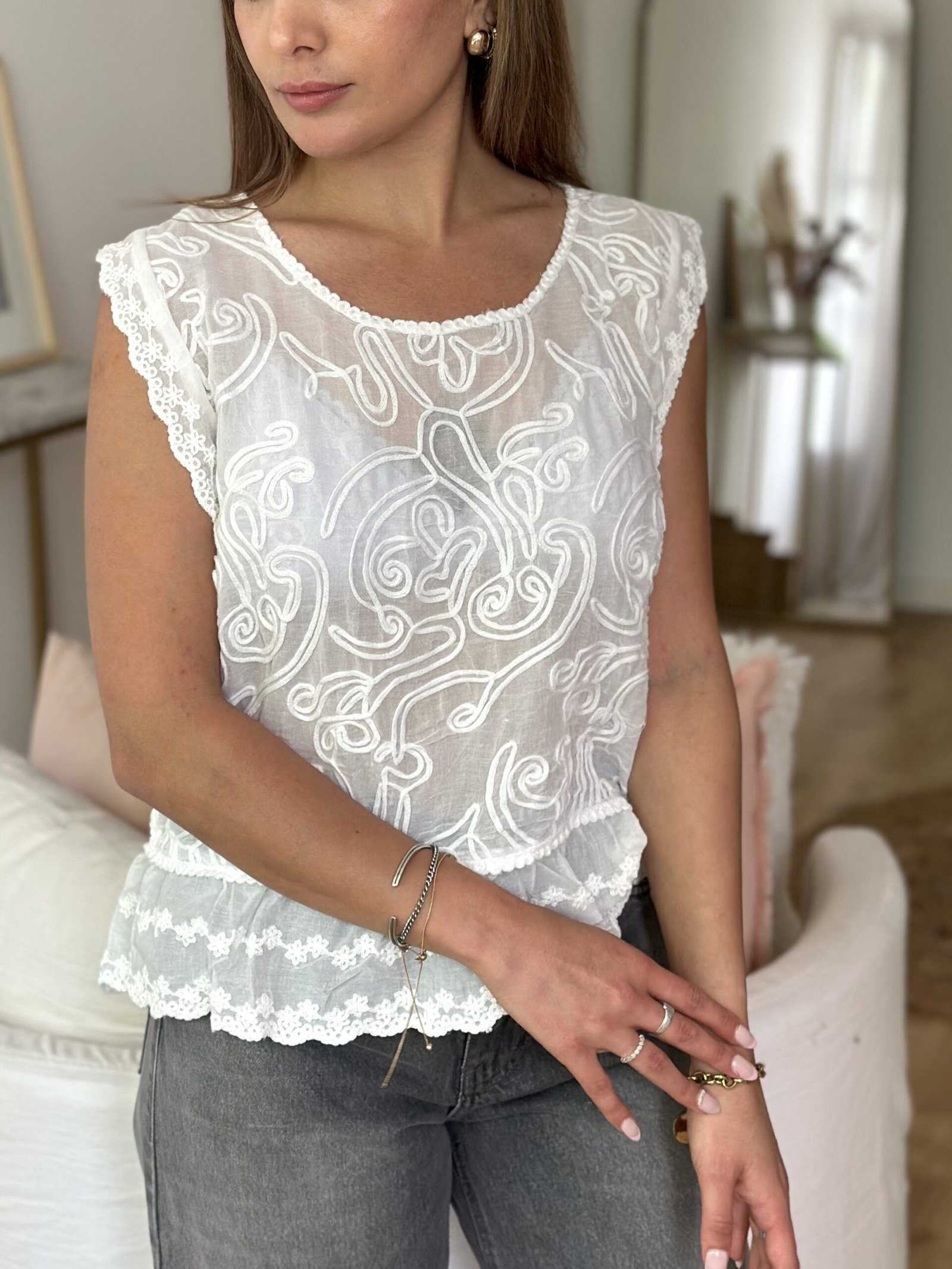 Blusa detalle de puntilla abajo y mangas Contorno de busto: 90 cm Largo: 45 cm Composición: 100% algodon