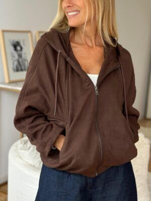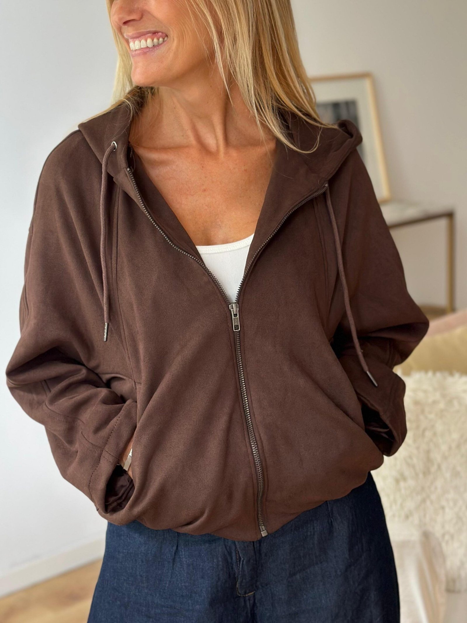 Campera de gamuza, tipo over con forreria, capucha con cordones a tono