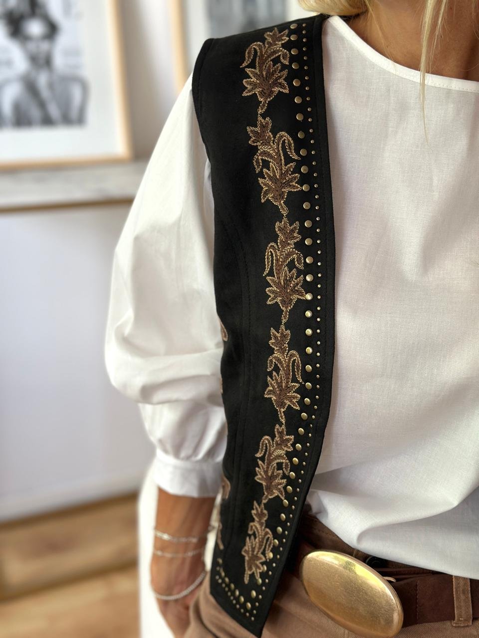 chaleco de escote v forrado a tono detalles de bordados y tachas