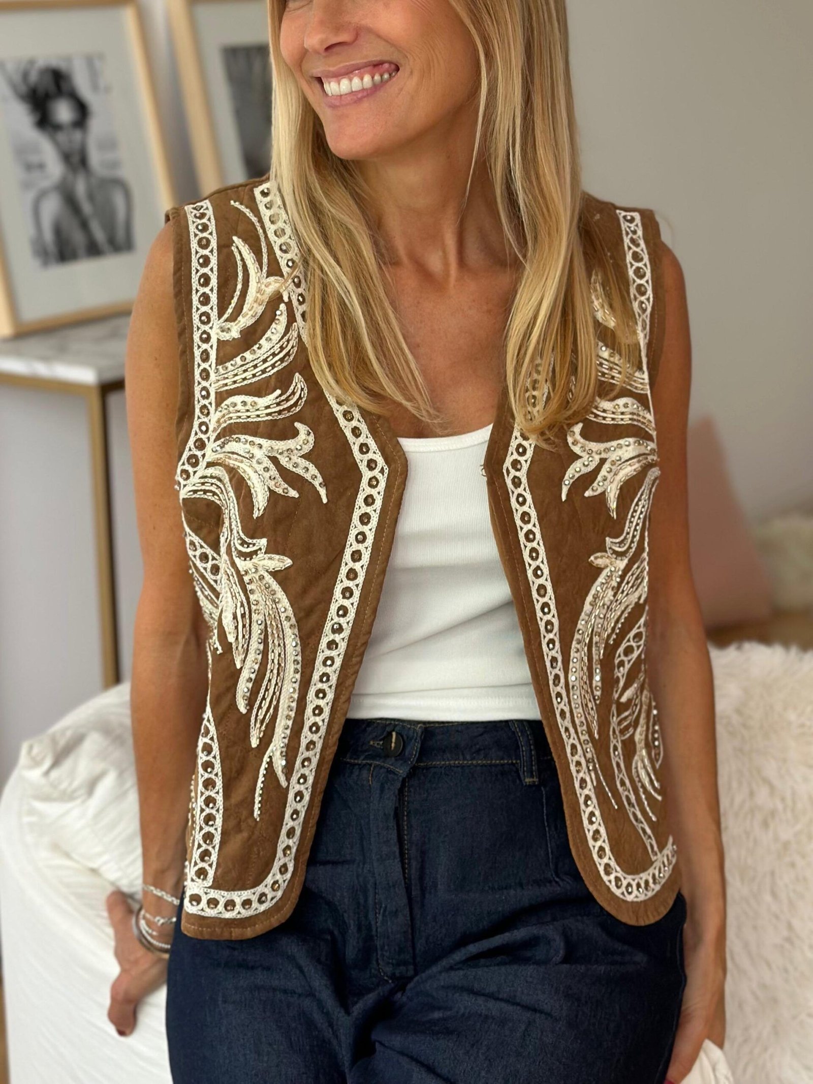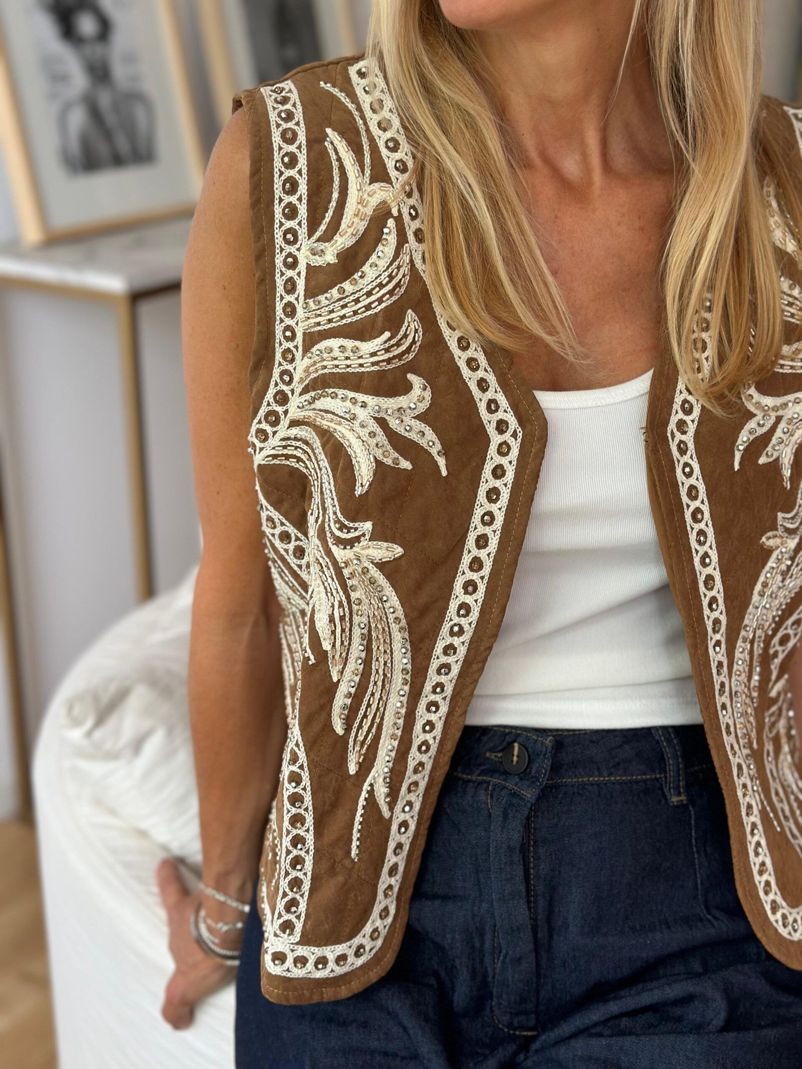 Chaleco forrado gamuzado matelase, con bordado y canutillos