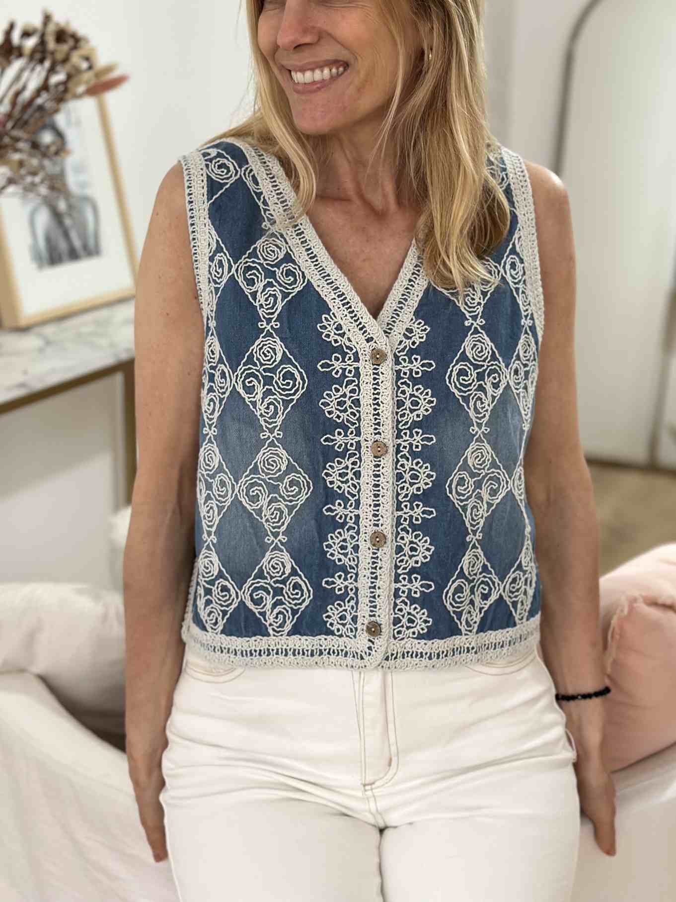Chaleco jean bordado Contorno de busto: 92 cm Largo: 48 cm Composición: 100% algodón