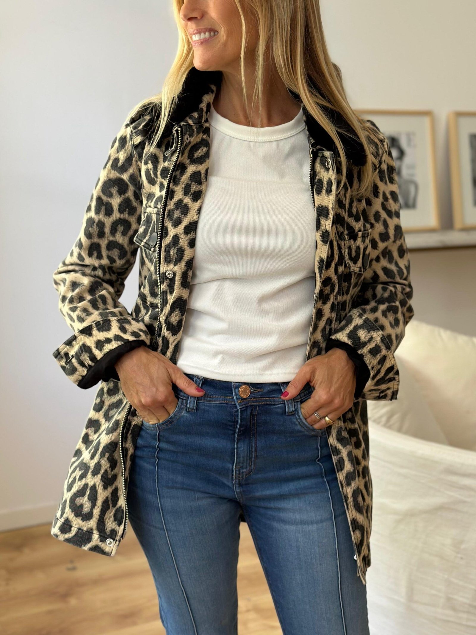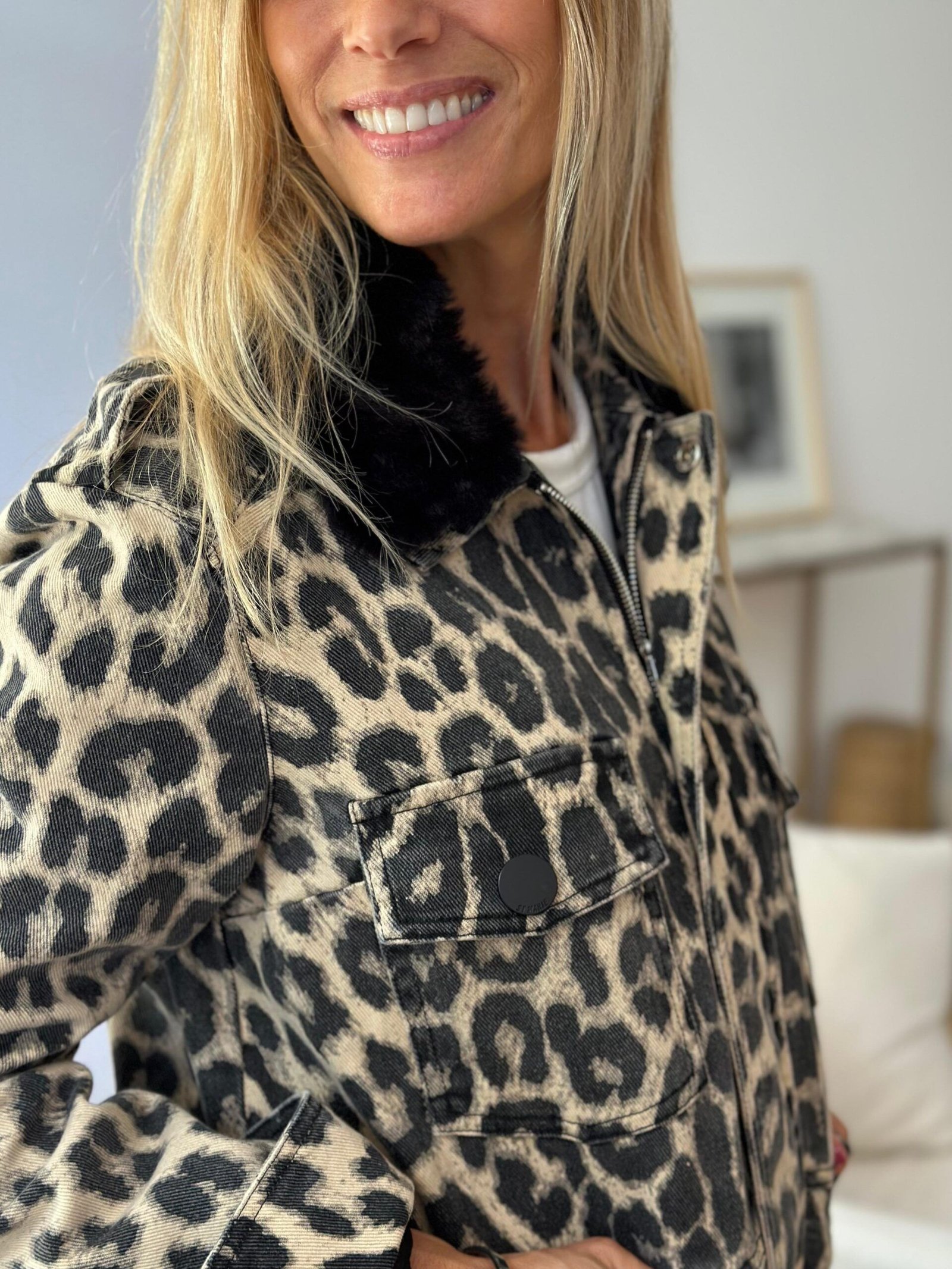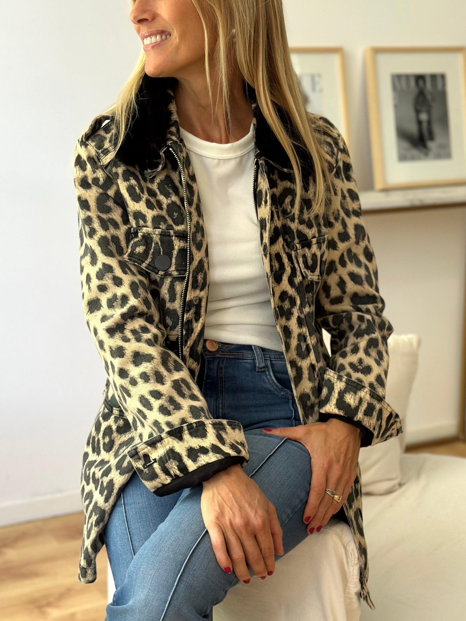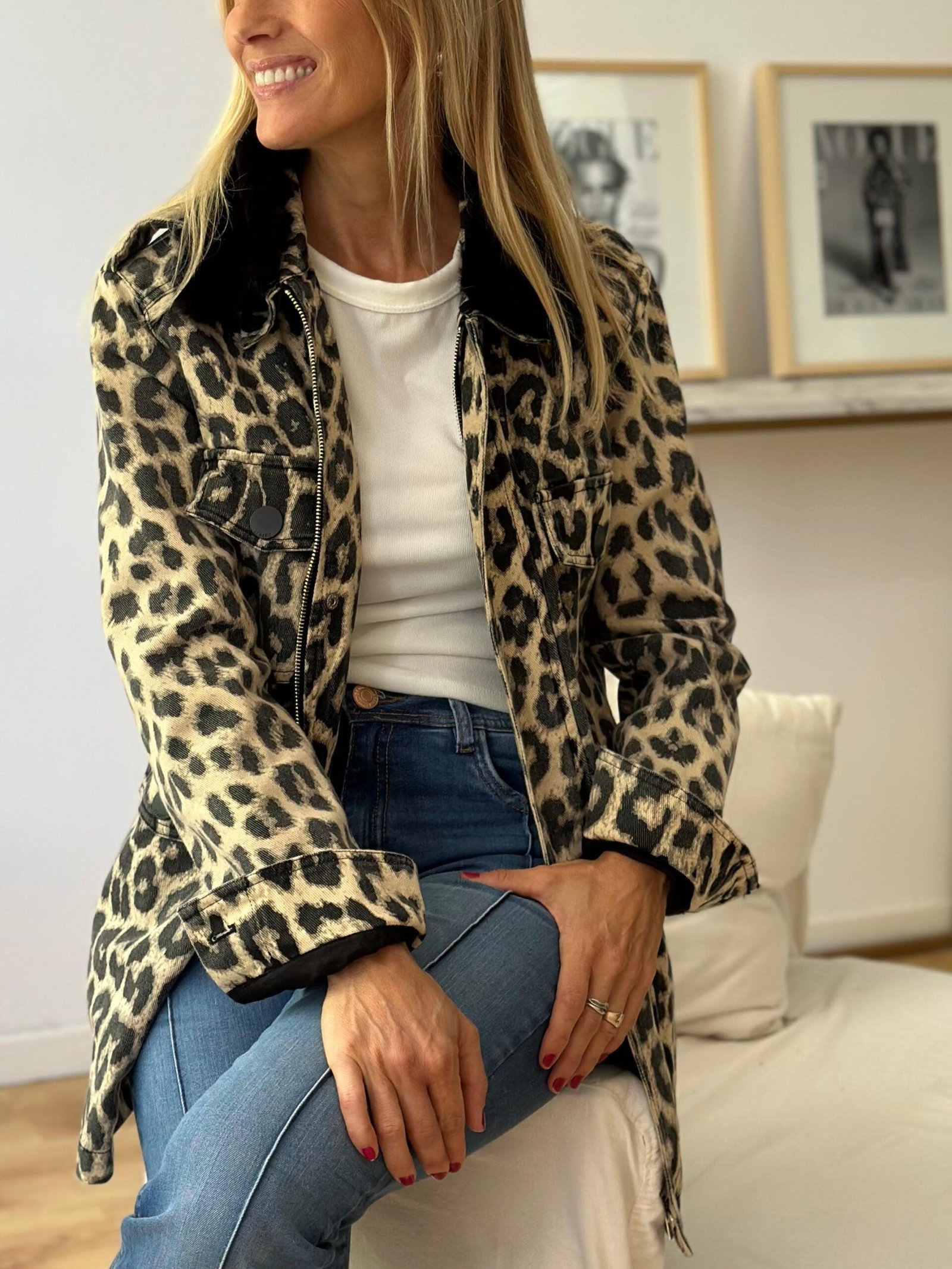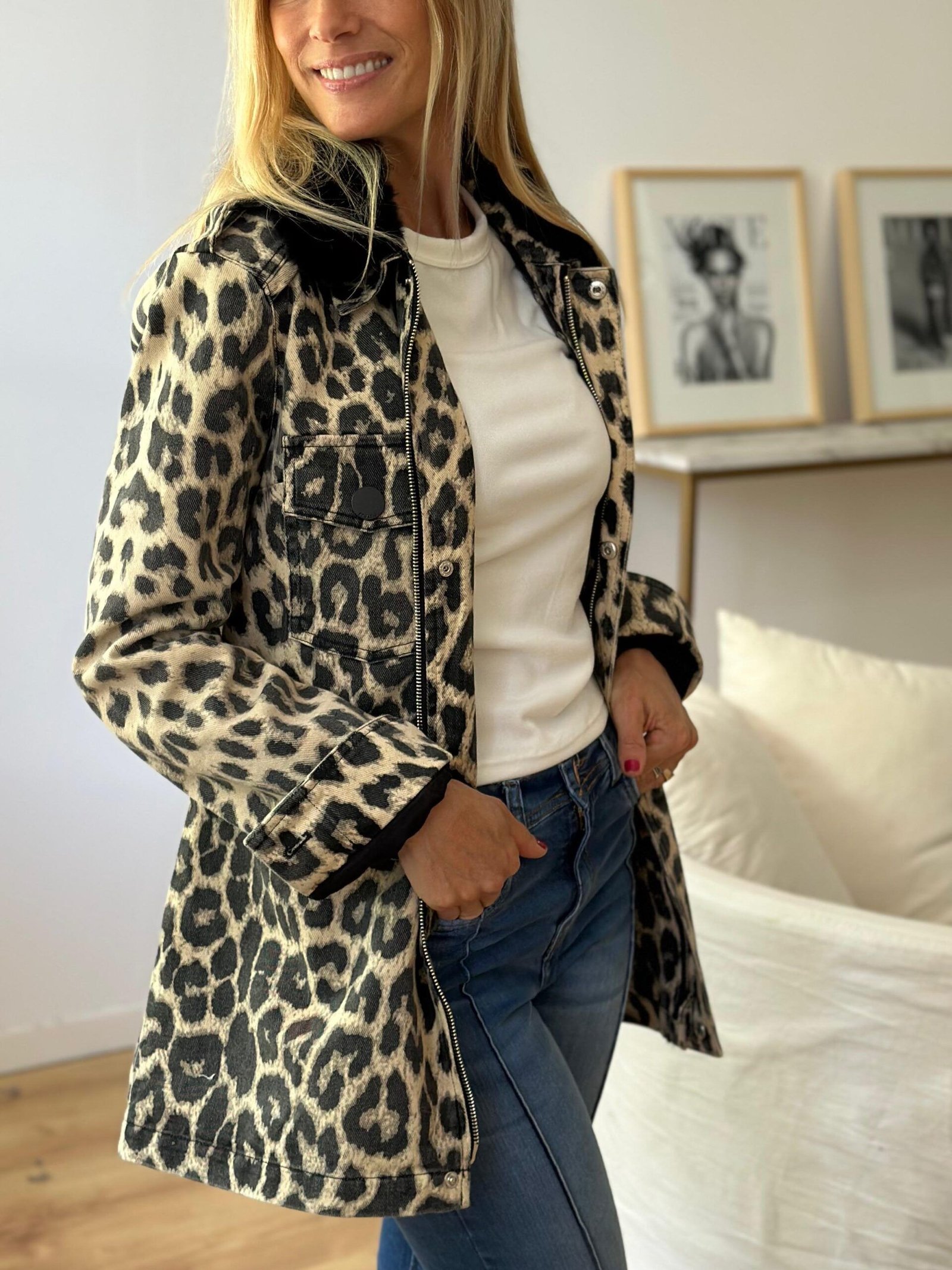 Chaqueta de gabardina estampada en animal print cuello de piel extraible en color negro, forrada, doble cierre (St Marie)