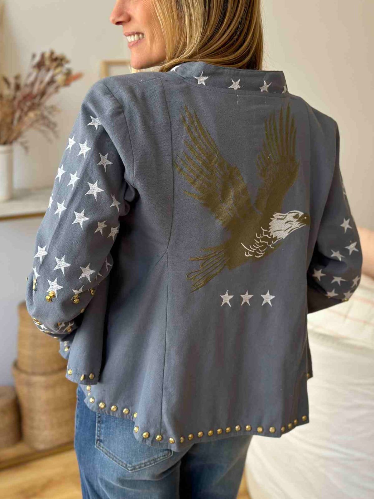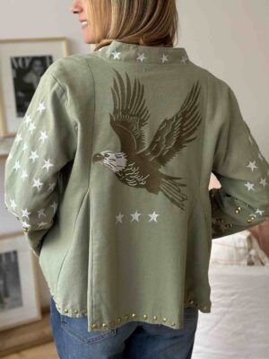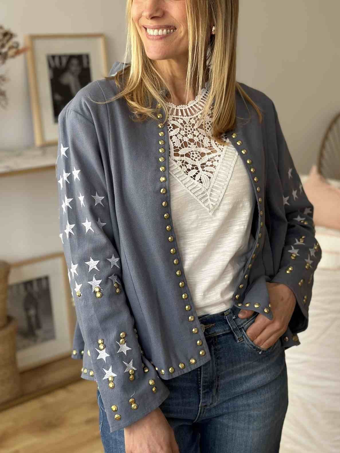 Chaqueta gabardina bordada forrada, estampada y con aplique de tachas