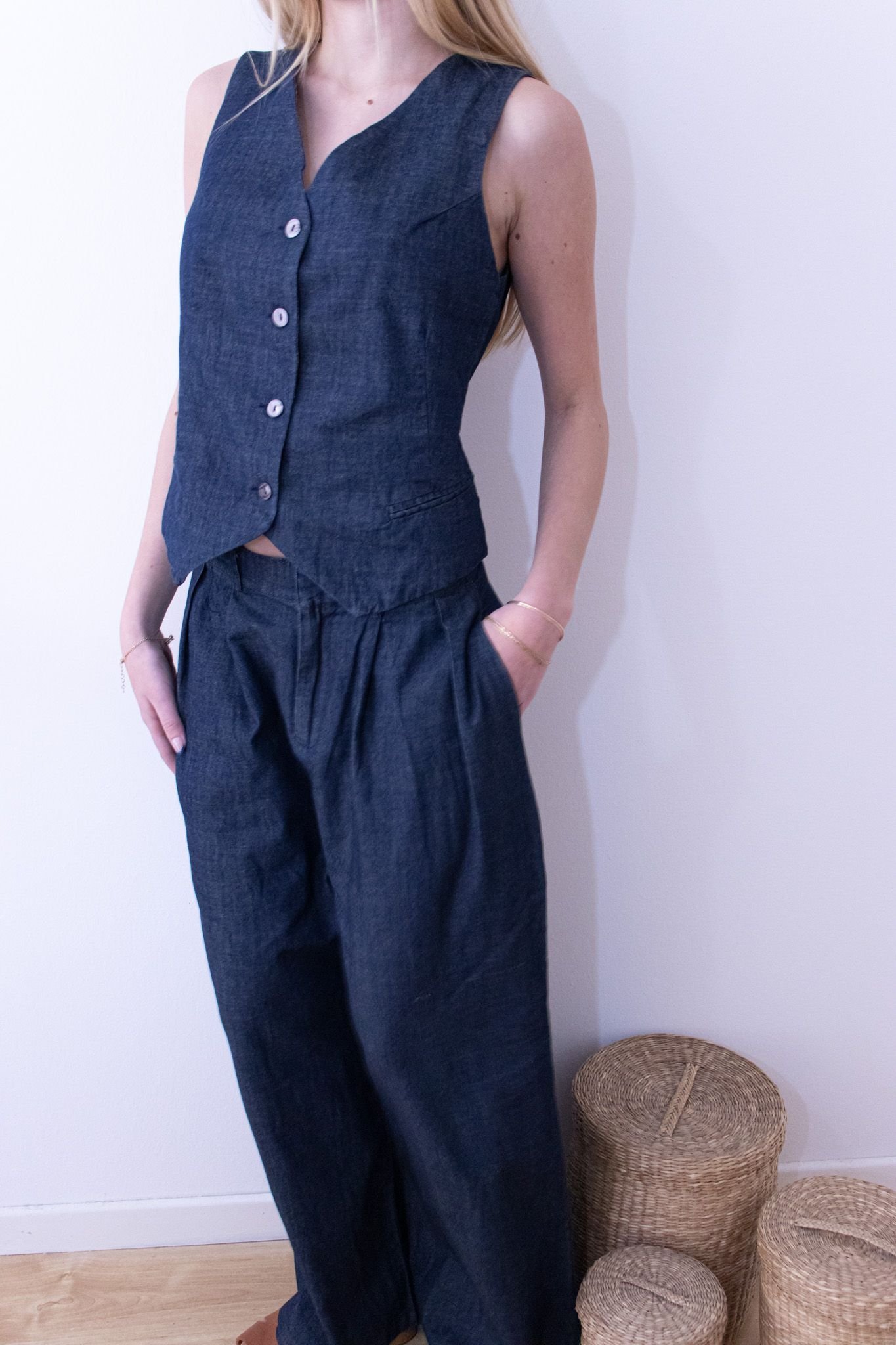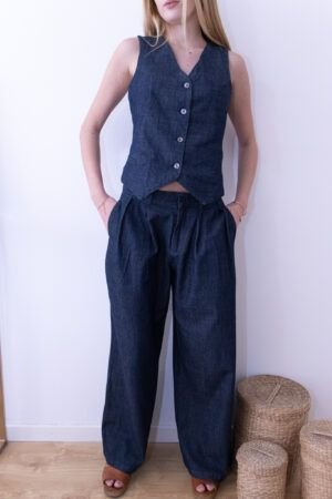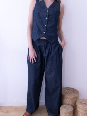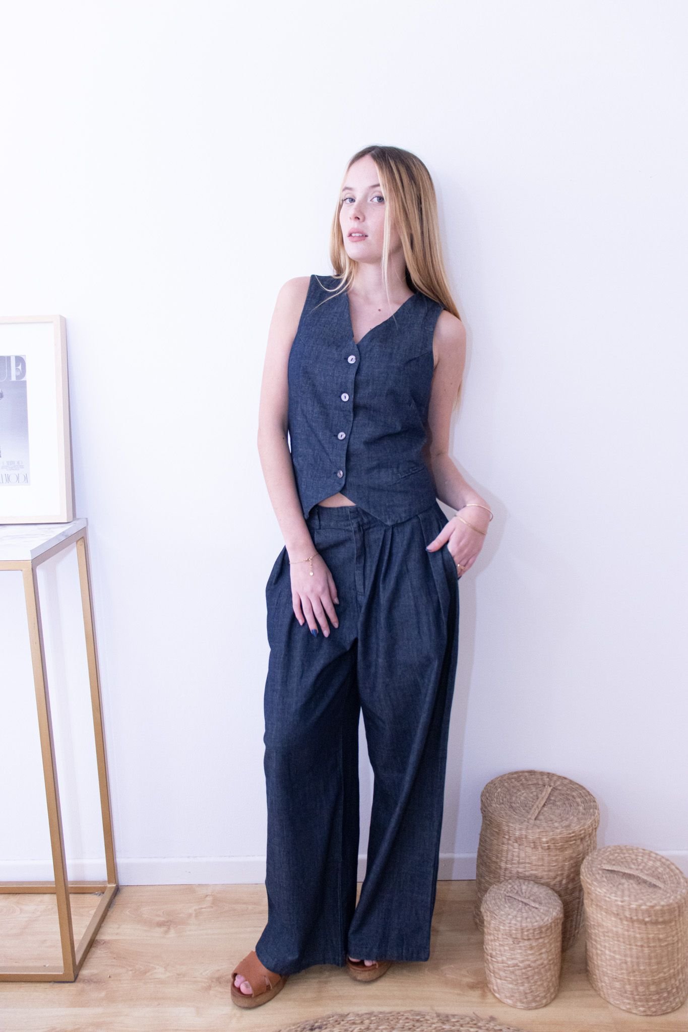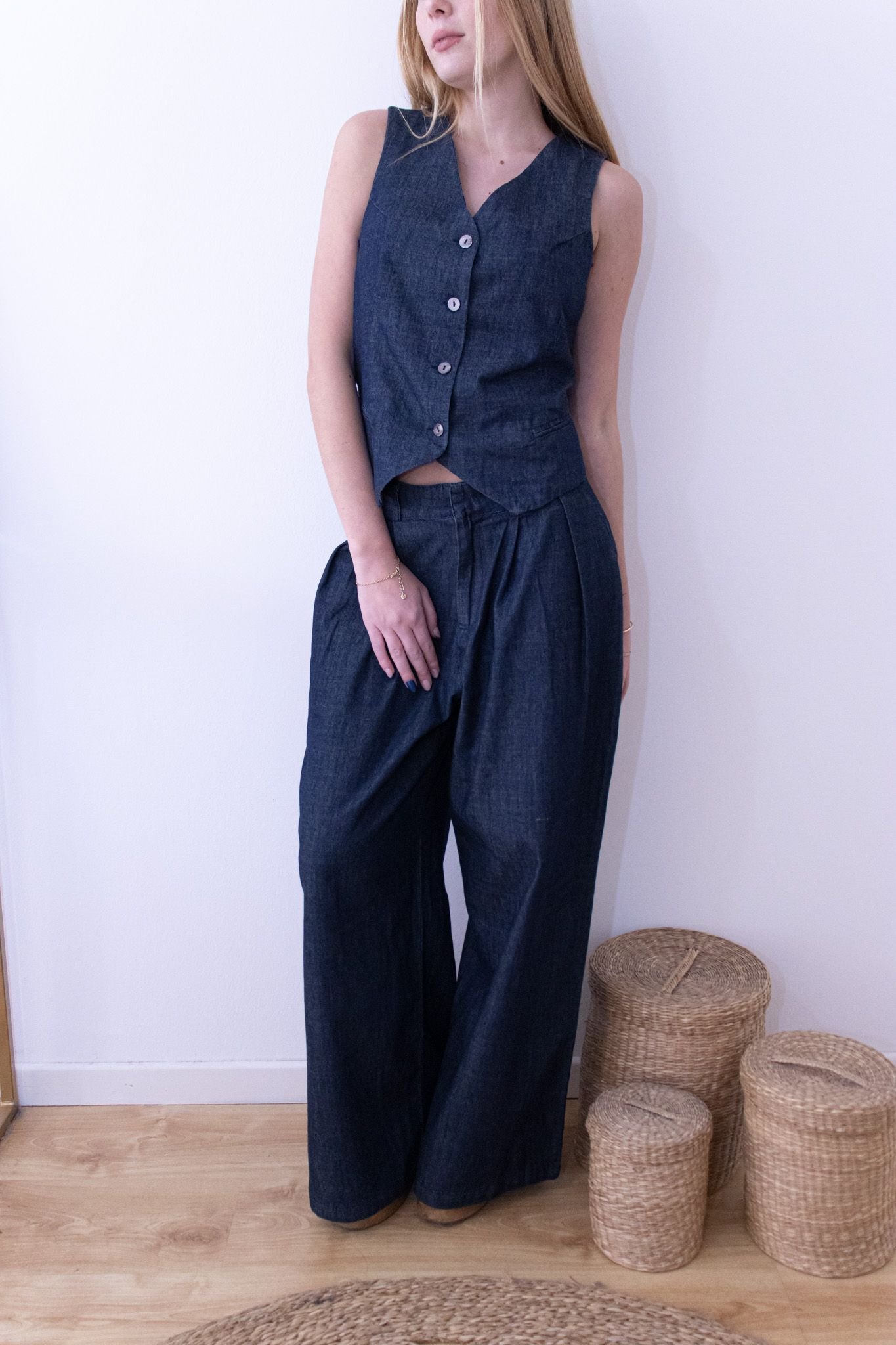 Conjunto jean liviano chaleco con martin gala forrado y palazo sastrero