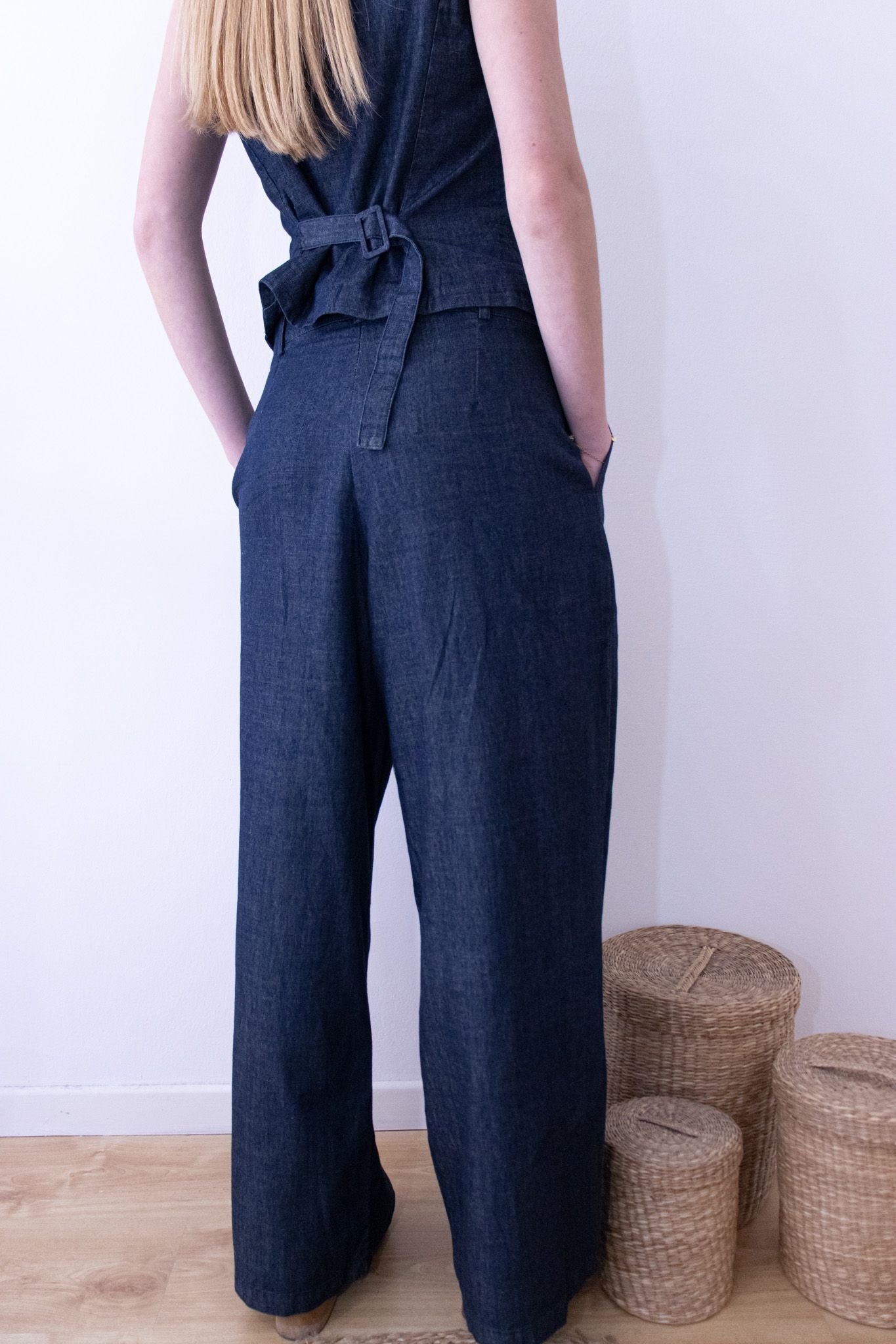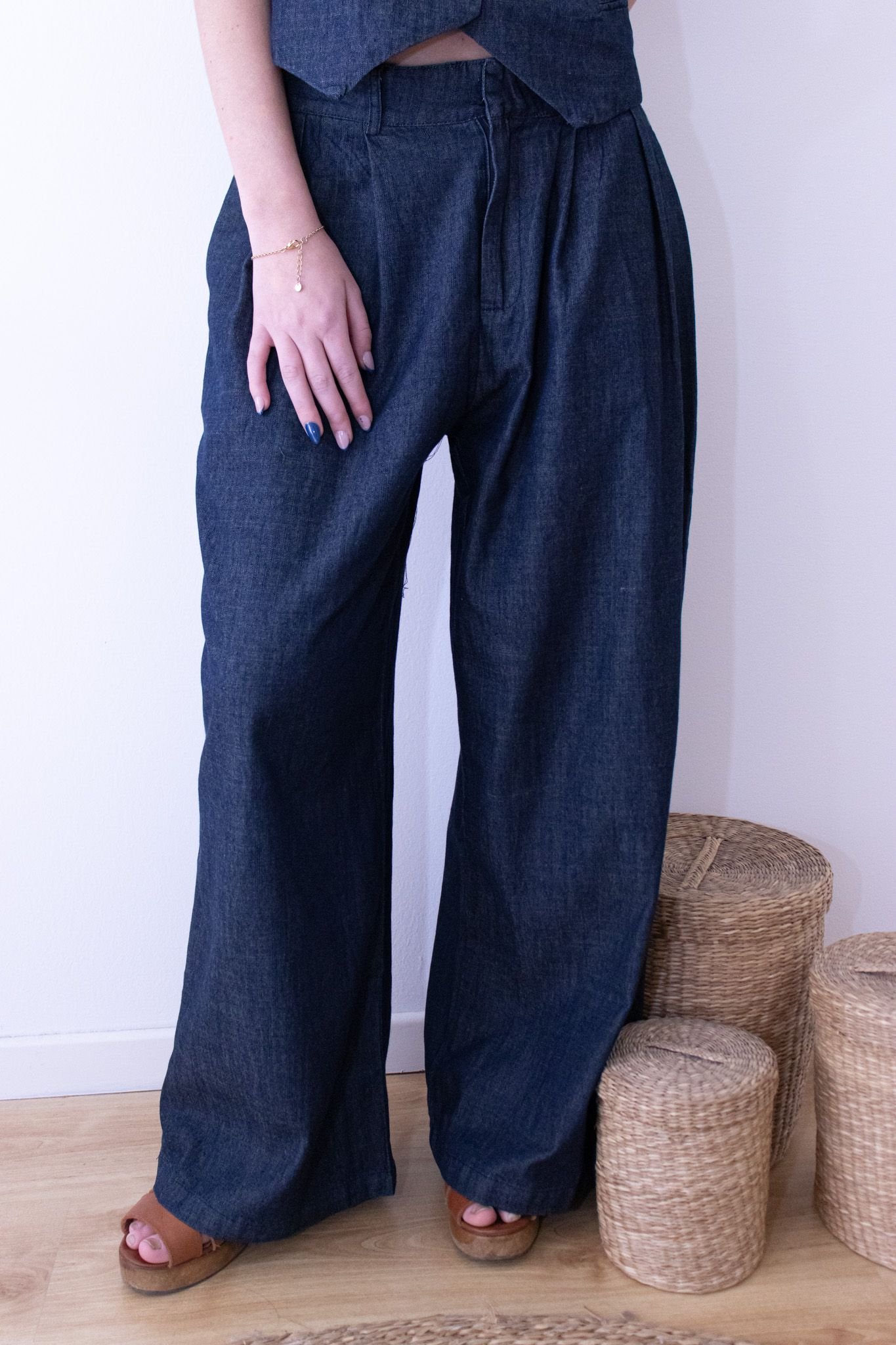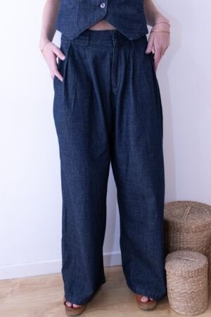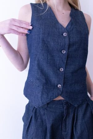 Conjunto jean liviano chaleco con martin gala forrado y palazo sastrero