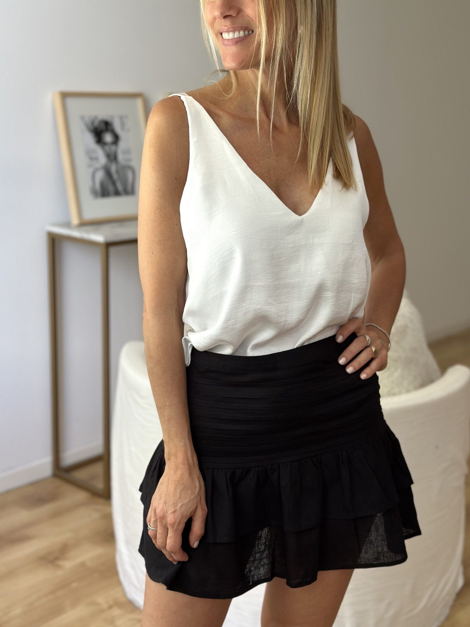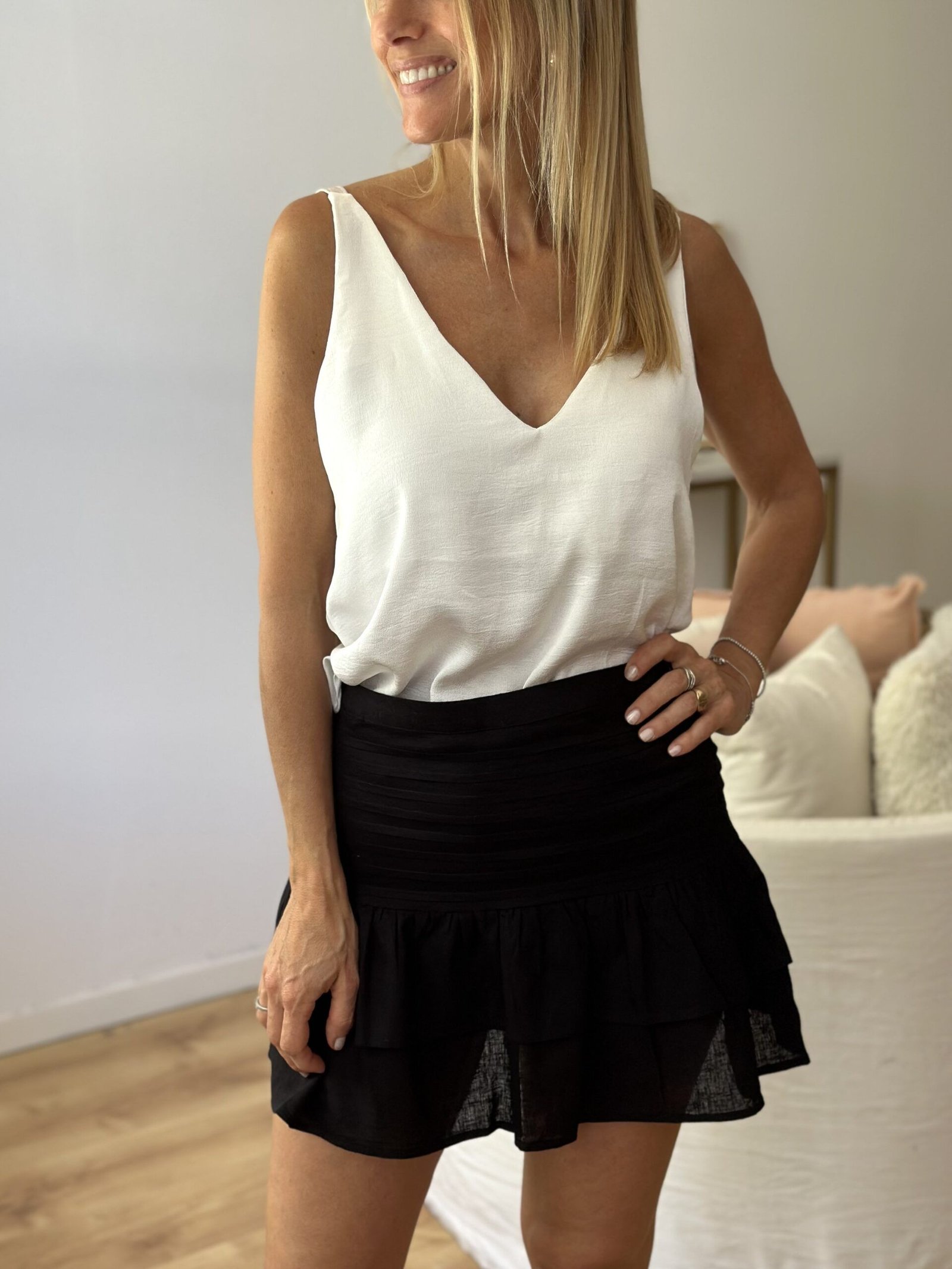 Mini tipo lino con cierre lateral y short, tablas horizontales y volados