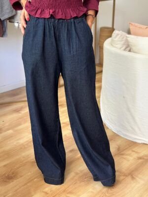 Pantalón ancho en denim camisero con cintura elastizada y bolsillos