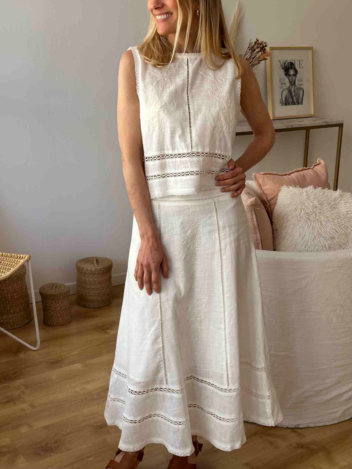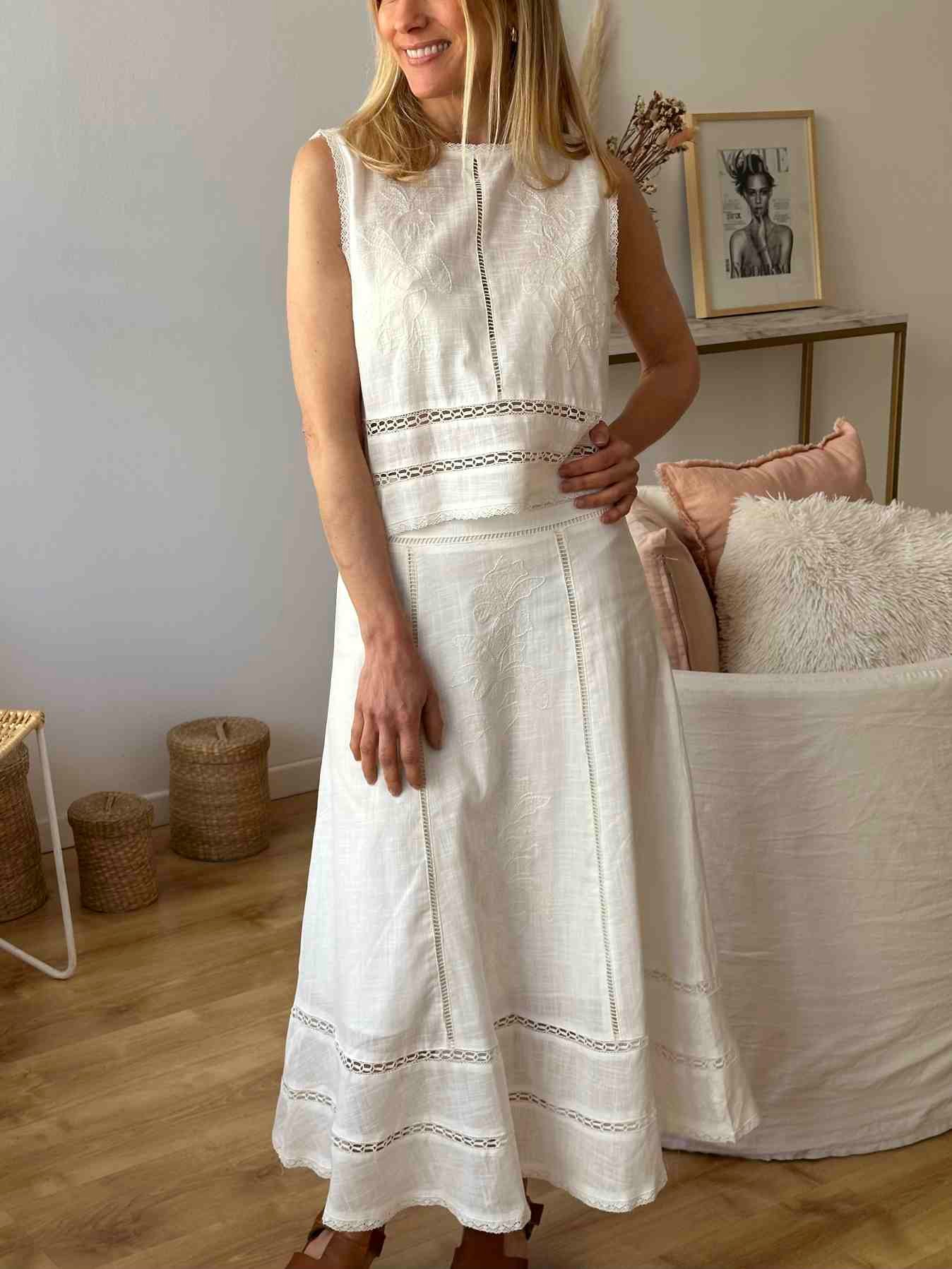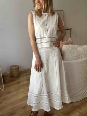Pollera media pierna evase, lino forrada con cierre lateral, bordados y detalles