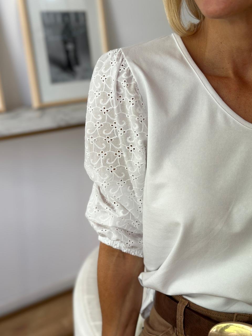 Remera manga al codo broderi y morley Contorno de busto en plano: 92 cm Largo: 56 cm Composición: