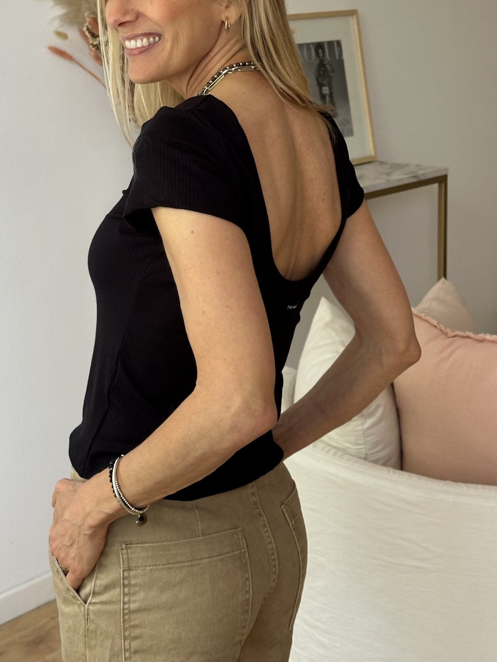 Remera de morley cuello U, mangas cortas y espalda profunda como detalle principal
