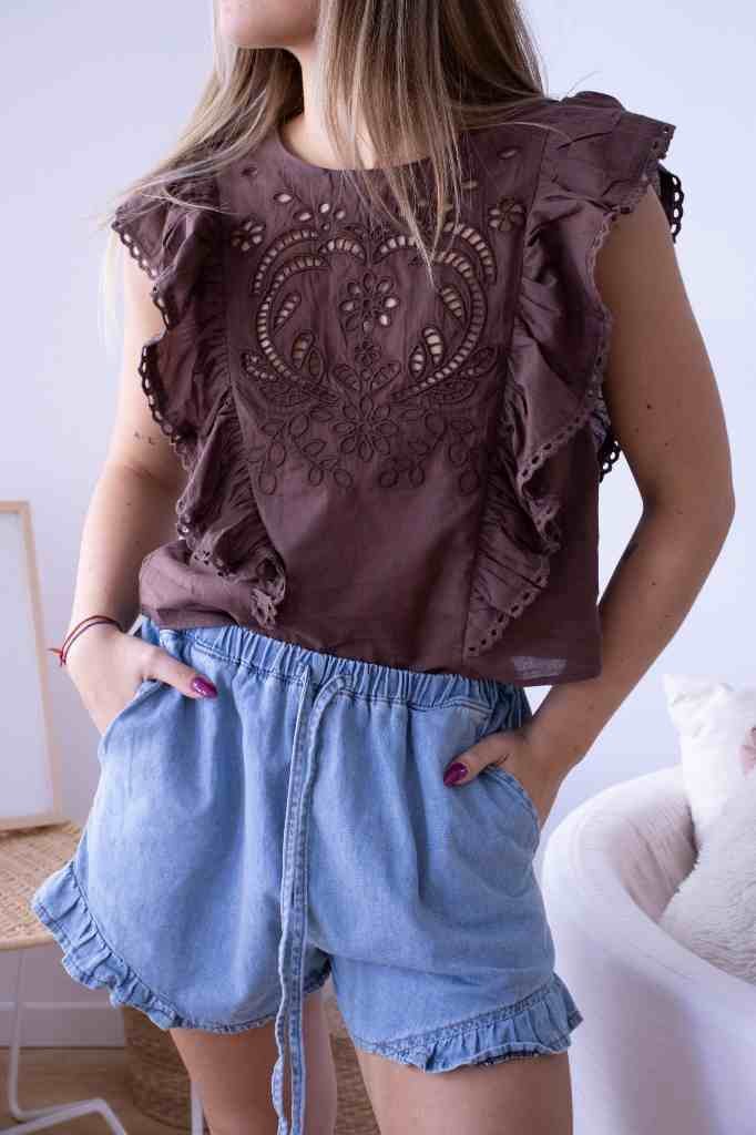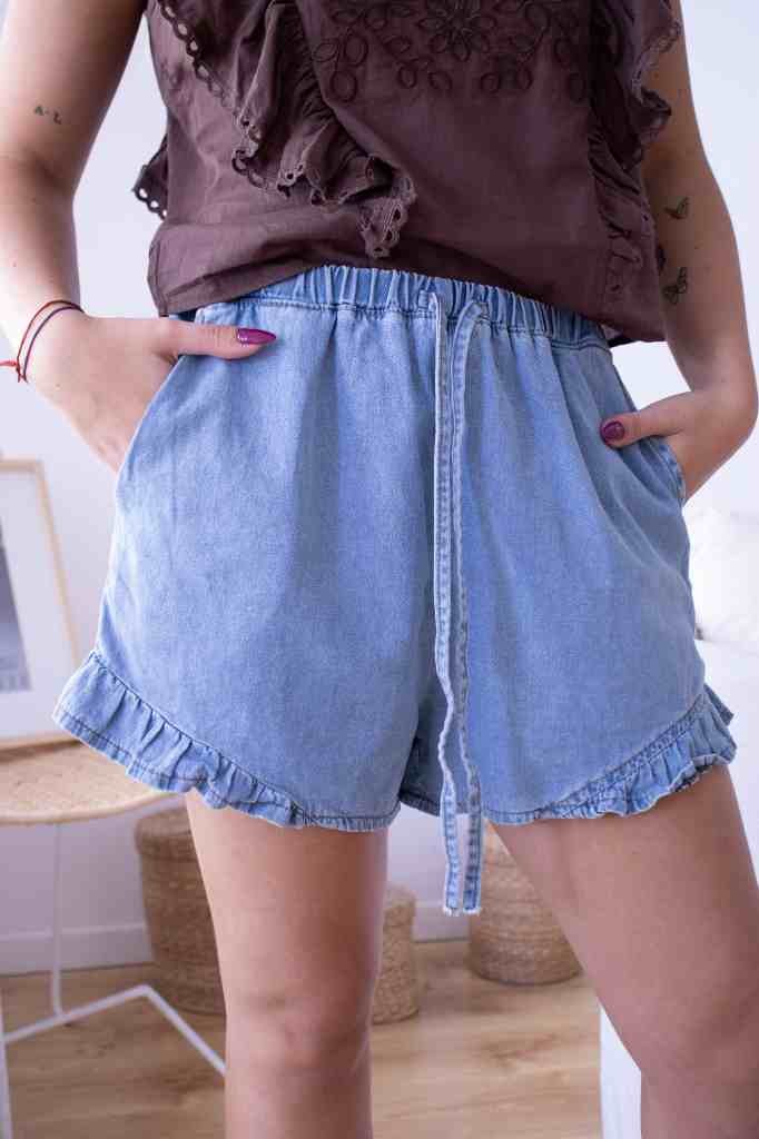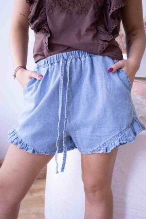 Short de denim camisero con bolsillos laterales, cintura elastizada con lazo atracado y volados en ruedo