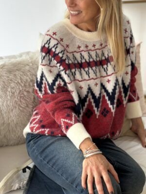 Sweater tipo bariloche de pelo, cuello redondo amplio, simil bremer y pelo