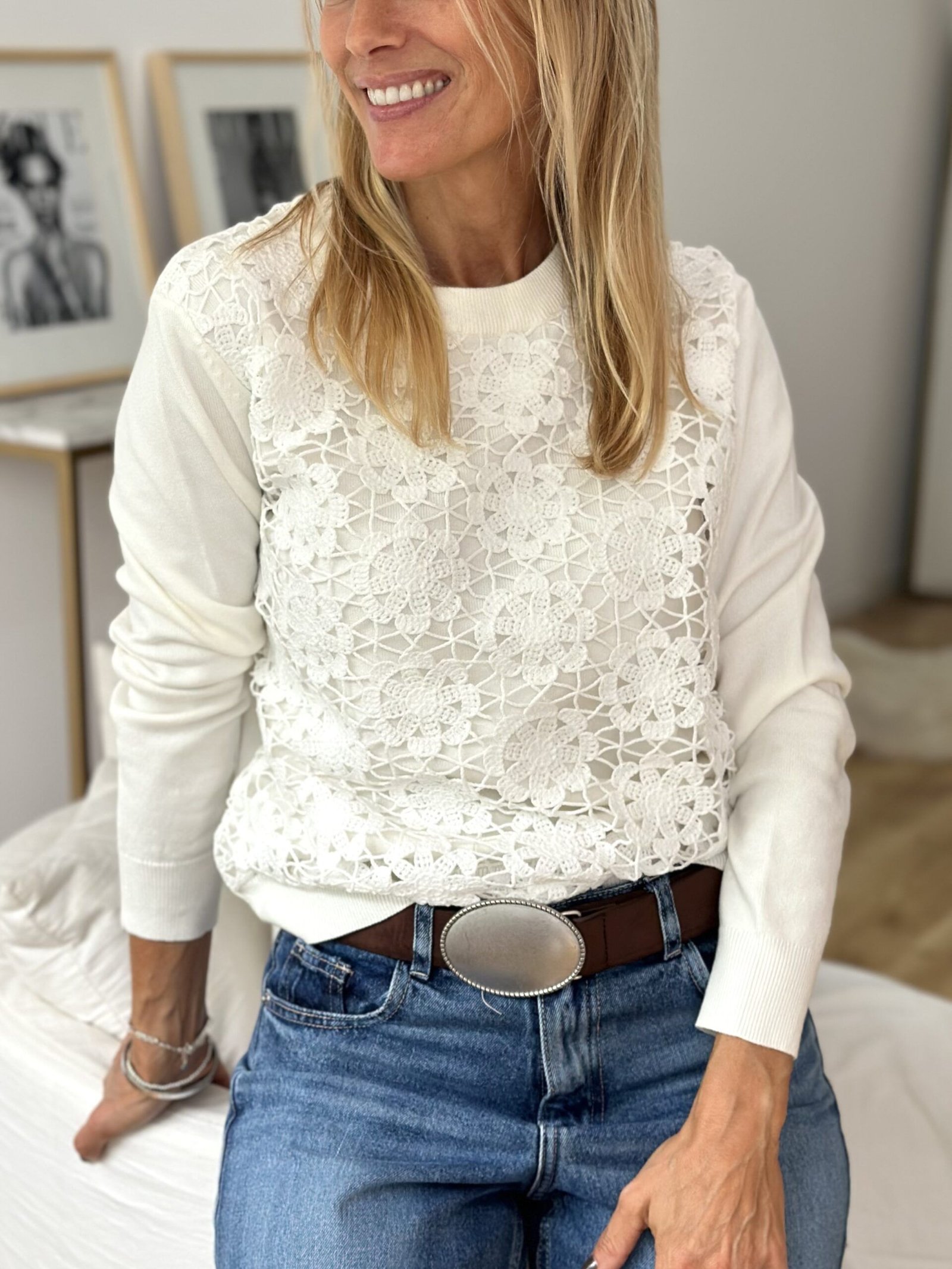 Sweater lana fina con detalle de crochet en frente