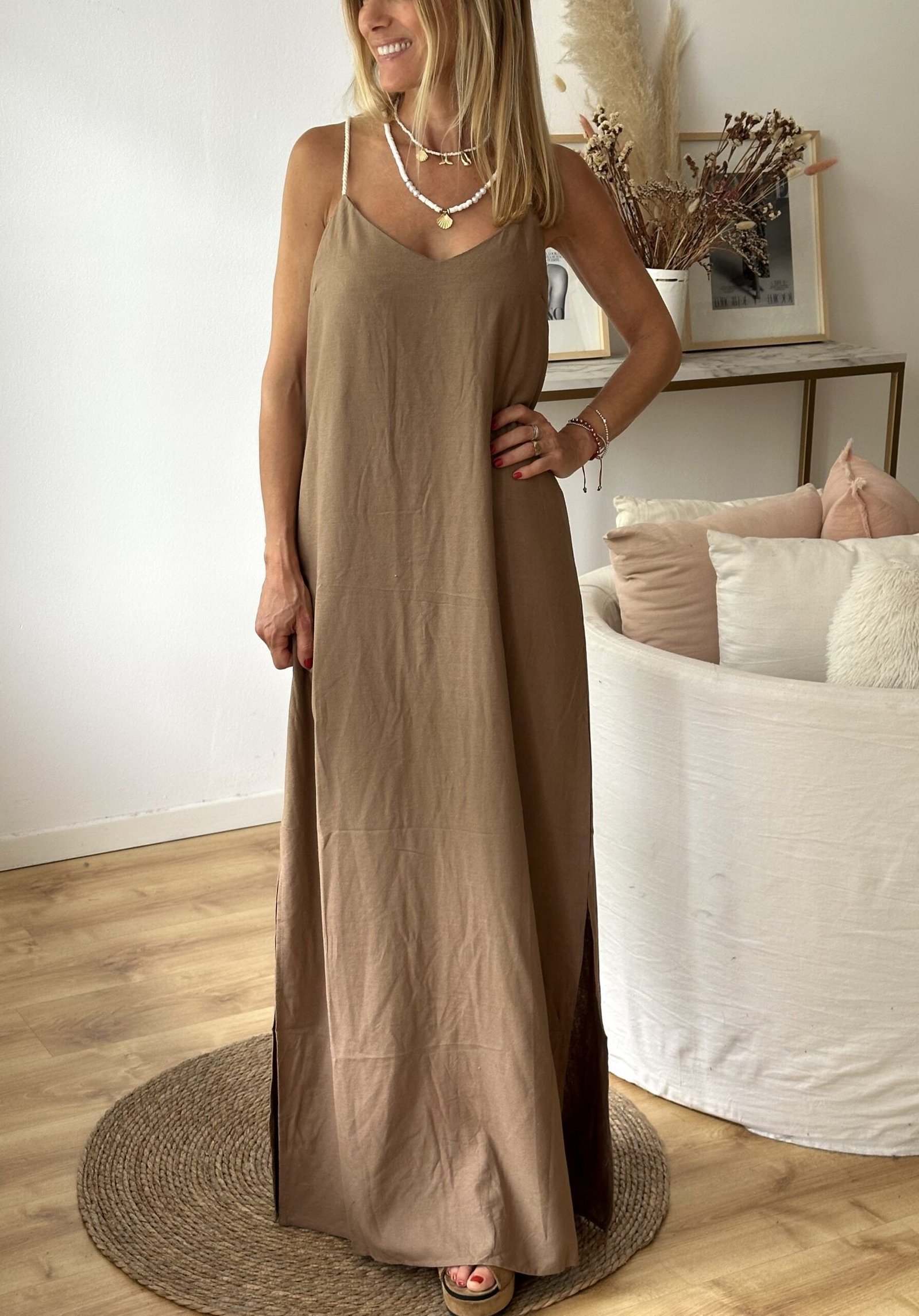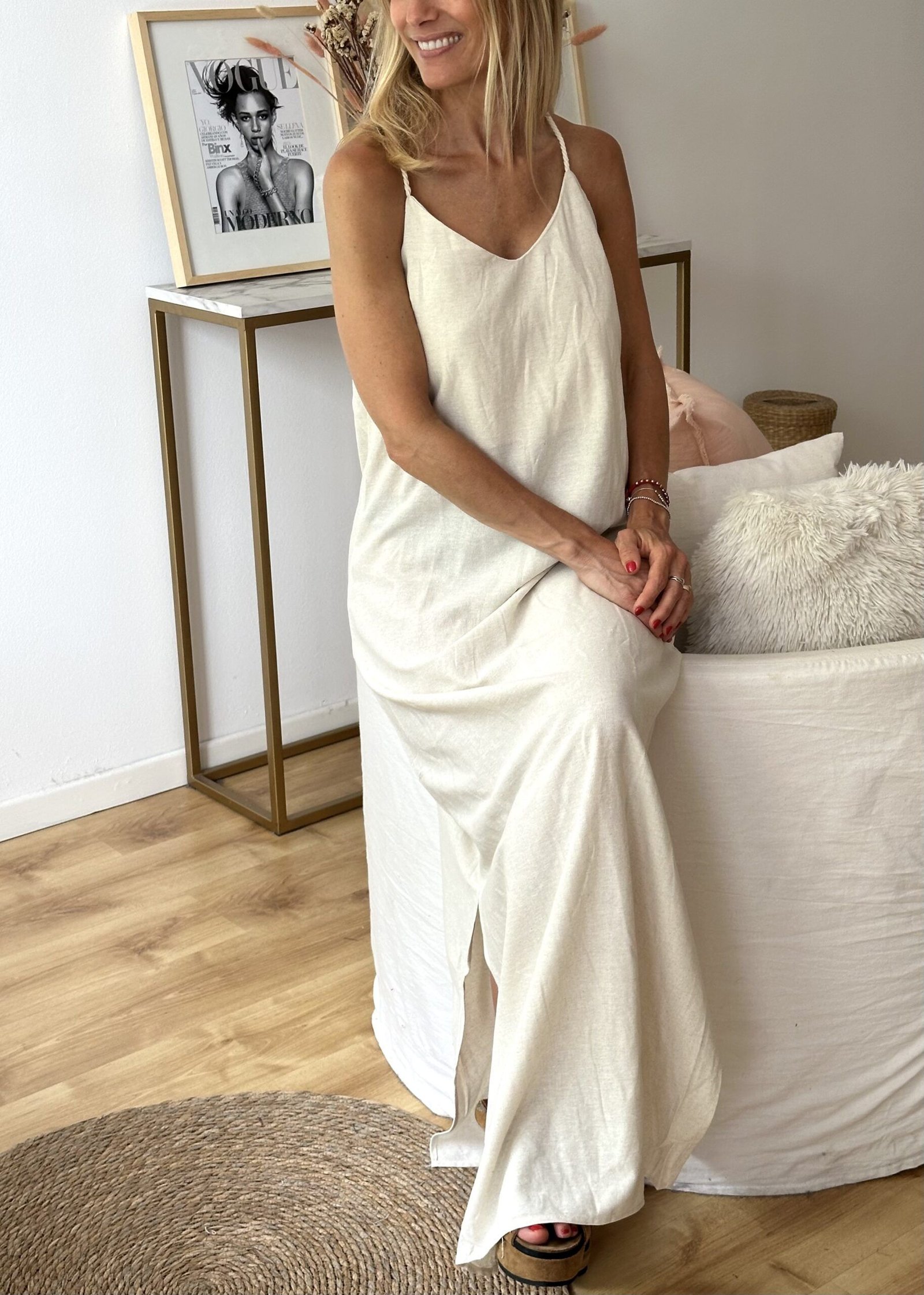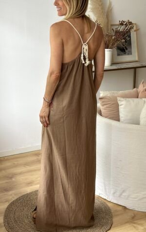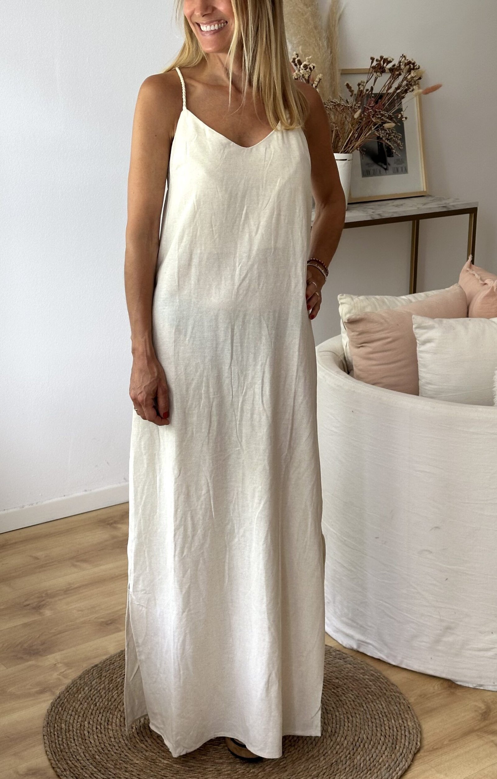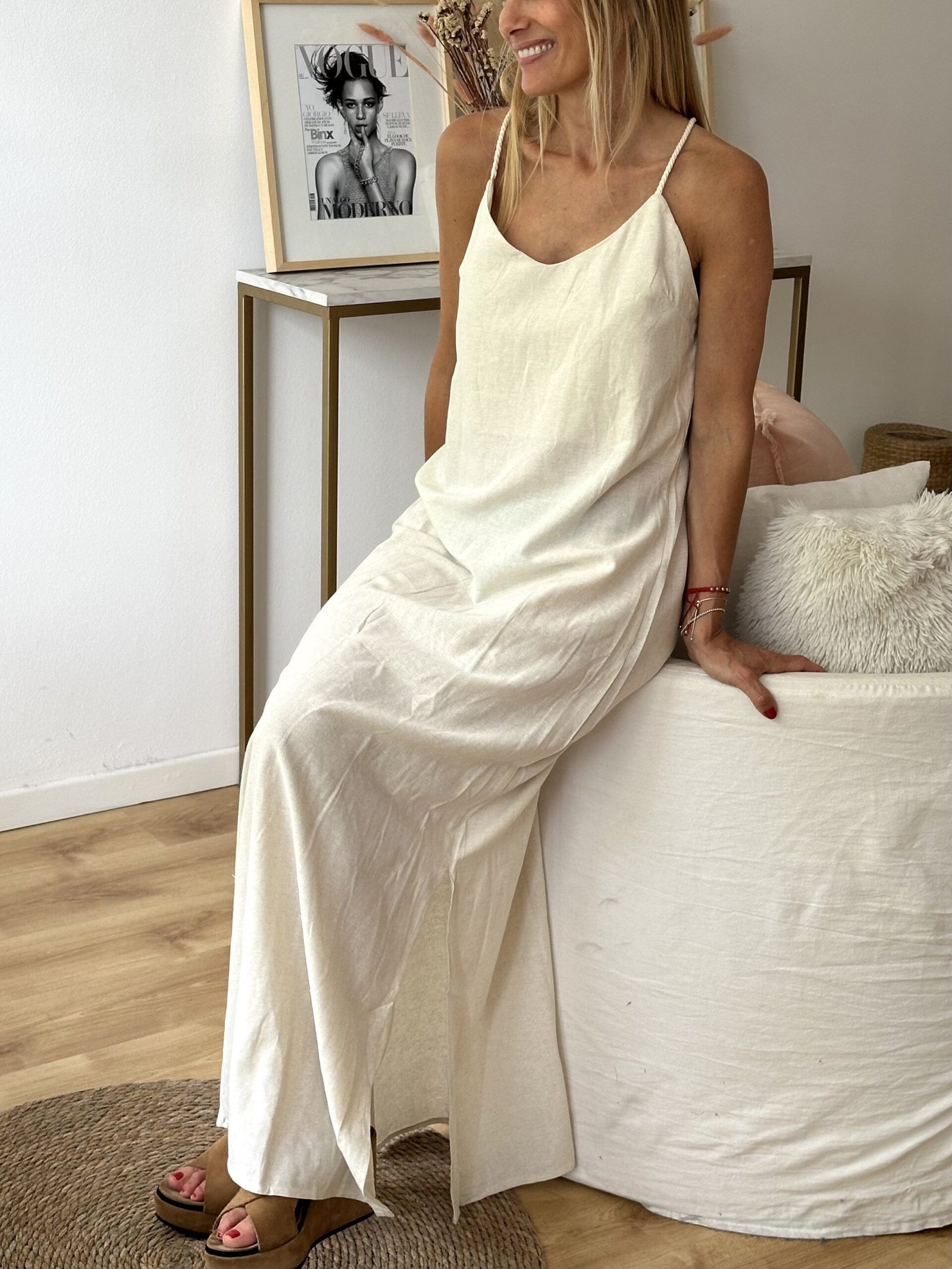 Vestido lino breteles soga tajos laterales medio elastico en espalda